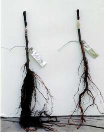 Benchgrafts (whip-and-tongue) ready for planting: Graft on left is MM111