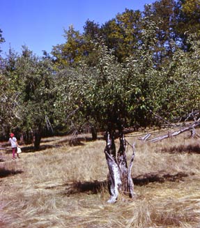 As the years passed, much worthy fruit was probably lost to windstorms, lightning strikes, marauding bears, and itchy cattle. Neglect, while not always benign, was probably not as harmful as misguided attention. Etter's foundation trees - some bearing up to twenty different grafted varieties - could not withstand the onslaught of a pruning crew mainly interested in smokewood. Who knows how many pomological treasures went up in smoke? So now, more than fifty years after Etter's death, almost nothing of his once magnificent apple experiment remains standing........