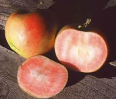 culinary apples and ornamental crabs using Malus pumila "Niedzwetzkyana". Descriptions of the Rosetta™ Apples (in ripening order)PINK PEARMAIN® ( CV. Etter 14-9) Ripening a week or two after Pink Pearl (early September), this can be an exceptionally colorful and attractive fruit: deeply red/red-striped skin covering vivid mottled pink flesh. Like Pink Pearl, it must be fully ripe for maximum sweetness and color. The aromatics are complex and suggestive of berries. Its main drawback comes from its ripening season; the intense heat common here in August and September can adversely affect texture and flesh color. (Pink Pearl also suffers to some extent.) Nevertheless, in a good year - or in a cooler climate - Pink Pearmain® is a unique and worthy variety. It is also the latest blooming of the group, an advantage for frosty locations.