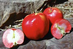 A large handsome fruit with bright red stripes and splashes over a cream background: the flesh is mottled pink and cream, almost as if an ordinary apple were stained with cherry juice. And the flavor and texture are amazing, making Pink Parfait® an unforgetable eating experience. It requires a long warm growing season and can be tricky to finish properly. Those who can grow this apple well are truly fortunate.