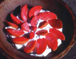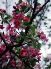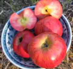 The apple we named Christmas Pink® does indeed make a charming ornament; the deep pink flesh color suffuses the creamy translucent skin. It is a briskly tart apple when we pick it at the start of the rainy season. After a few weeks in storage in the barn or refrigerator, it mellows into a richly flavored apple that can be enjoyed in salads, desserts, pies, or cider. The melting flesh is exceedingly juicy, so combined with its color it calls to mind a very sprightly watermelon.